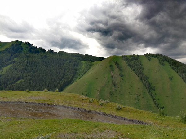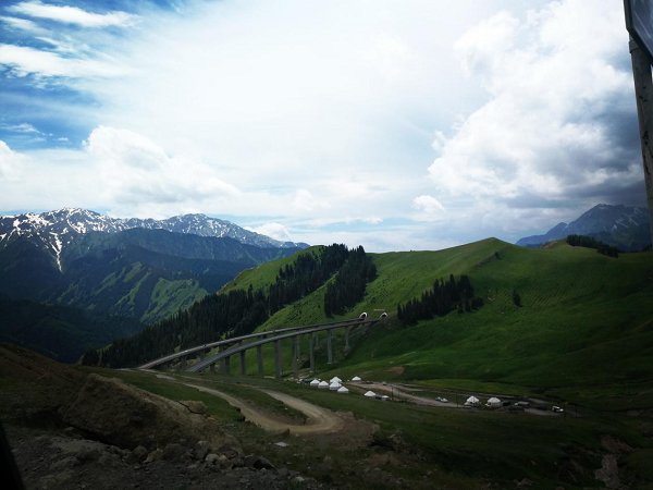 不一会儿,天空突然下起了大雨,大家都急急忙忙的躲进毡房避雨。不到十分钟雨停了,尽管如此,放眼望去山依旧那么美丽,给人以清新的感觉;果子沟大桥依旧气势宏伟,给人以无限遐想